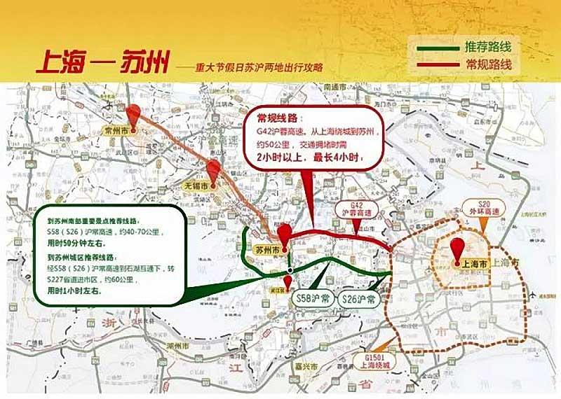 推荐路线:到苏州南部重要景点推荐路线:S58(S26)沪常高速,约40-70公里,用时50分钟左右。到苏州城区推荐路线:经S58(S26)沪常高速到石湖互通下,转S27省道进市区,约60公里,用时1小时左右。