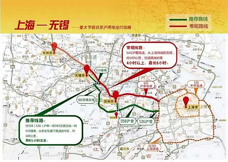 推荐路线:经S58(S26)沪常—转S83无锡支线—转S19通锡—转G42沪蓉,约170公里,用时2.5小时左右。