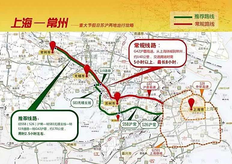常规路线:G42沪蓉高速。从上海绕城到常州,约140公里,交通拥堵时需5小时以上,最长8小时。