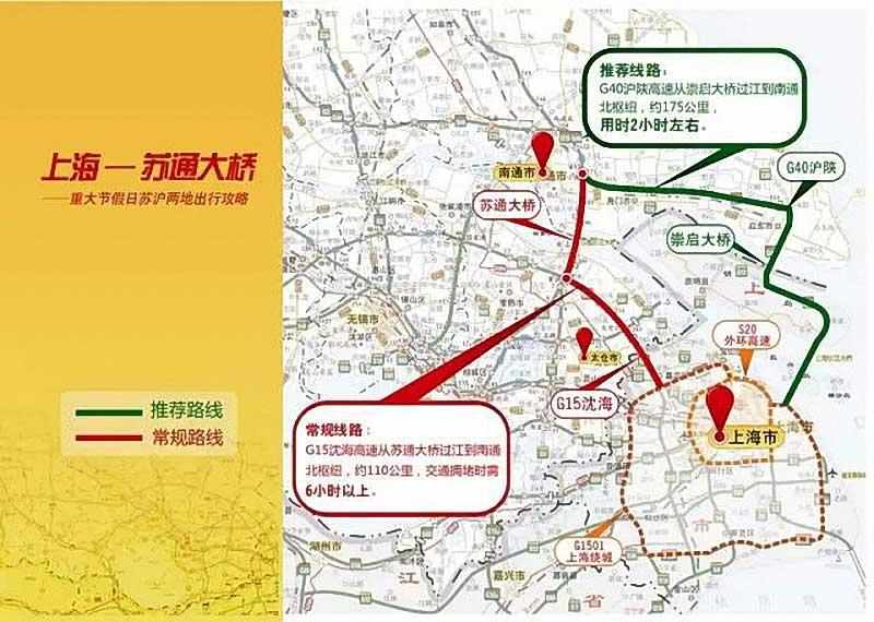 常规路线:G15沈海高速从苏通大桥过江到南通北枢纽,约110公里,交通拥堵时需6小时以上。