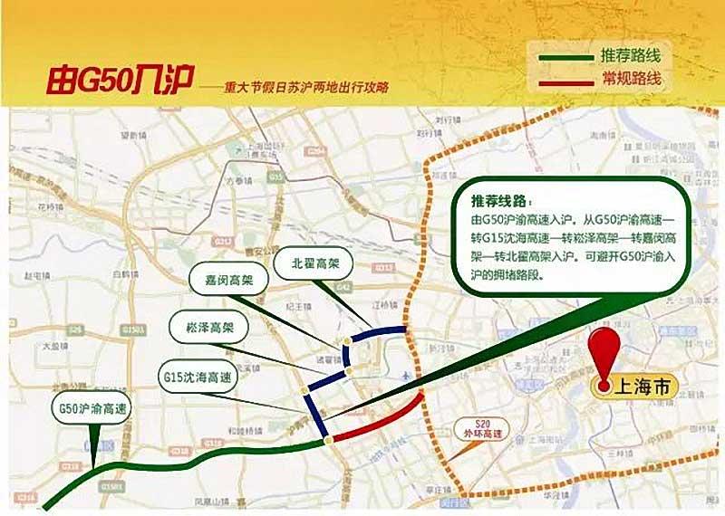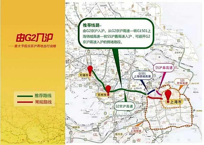 常规路线:G42沪蓉高速。从上海绕城到苏州,约50公里,交通拥堵时需2小时以上,最长4小时