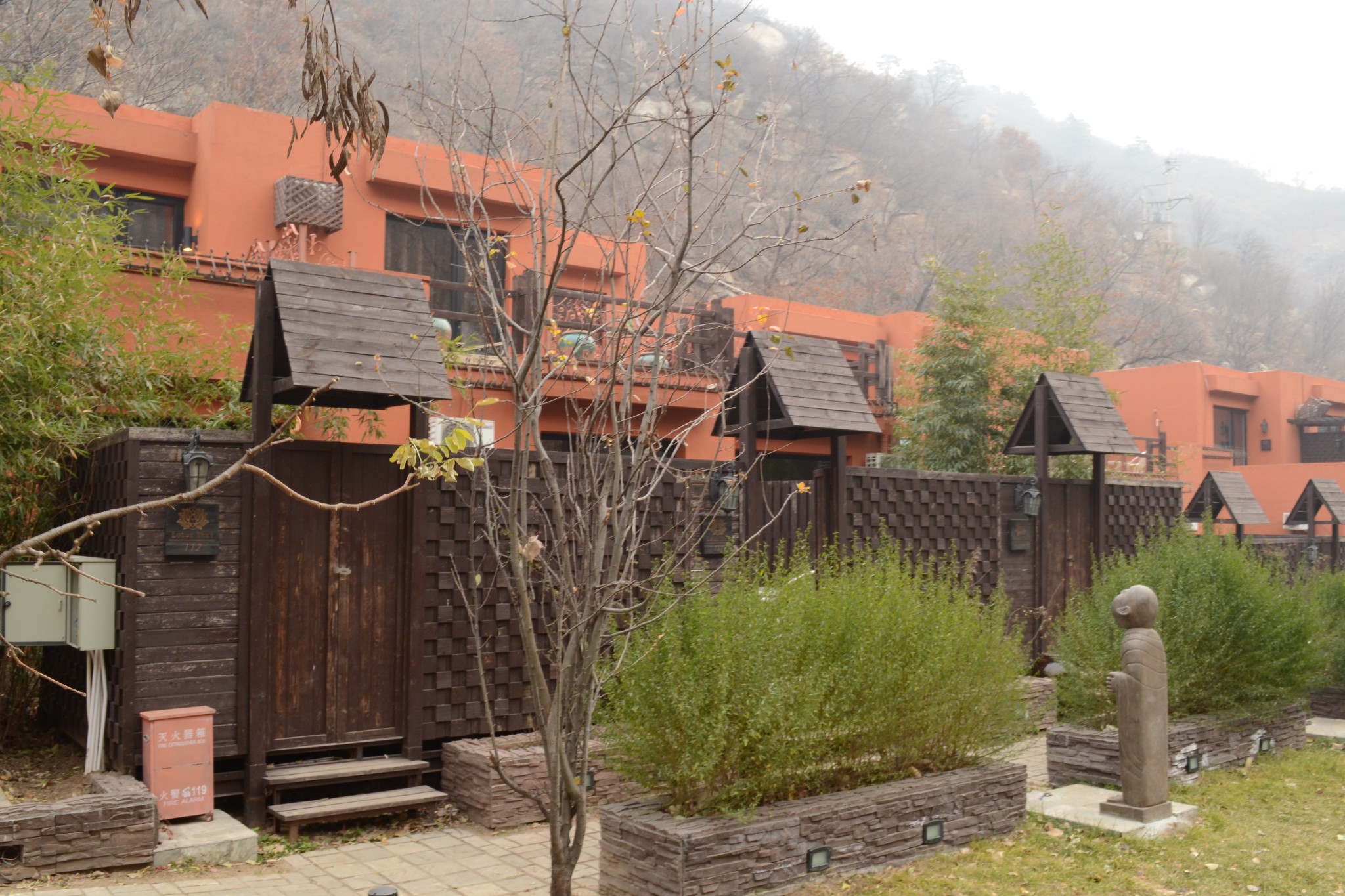 HIGH LIGHT的是怀柔那里主楼的独特风格,现代感浓烈的外观和朴实、原始的装饰完美结合,走在楼道中不时踩在鹅卵石上,走廊摆放了非洲风格的木雕,只有木雕从头到胸的裂痕在提醒你身处干燥的北京。房间各个不同,不同的主色调配合相适应的配饰,盥洗室像极了藏酷,黑水泥、突出的洗手盆。这里处处可以感受到主人精心设计和人性化的布置,想起大套间的名字不禁哑然失笑:1949新中国成立、2008北京奥运会、2003中国人登上太空,这是一个很有趣的主人修建的地方。