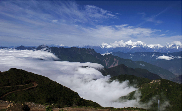 牛背山位于四川省雅安市荥经县境内,与泸定县交界,属二郎山分支,是青衣江、大渡河的分水岭,山顶海拔3600米,因山顶一面悬崖有巨石突出酷似牛头,山脊细长貌似牛背而得名。蜀山之王贡嘎雪山矗立于牛背山的正西最高点,山尖时时被厚厚的云团围绕着,很难见得其真面目。牛背山上的云海,浓密而均匀,时而平缓,时而汹涌,其壮观的云瀑无以能比,时时让人感觉踏步于空中。
