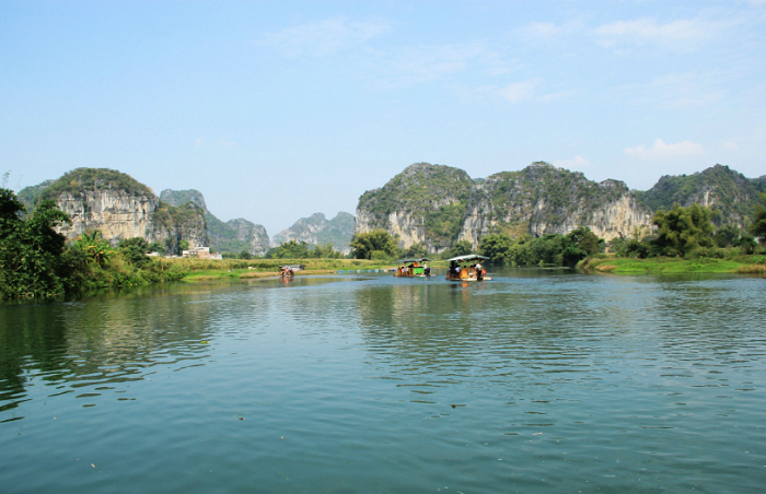 三里洋渡风景区位于广西壮族自治区上林县的东南部,距上林县城12公里,距广西首府南宁市128千米。景区包括上林县三里镇的大部分、澄泰乡洋渡村和附近村庄以及交界的乡镇。景区内山清水秀,洞穴各异,景观千姿百态,素有“小桂林”之美称。其中,上林霞客古渡景区是三里洋渡景区内最核心和精华的部分。最佳方式是乘游船游览,河水曲折蜿蜒,微风清凉拂面。既可远眺情侣山、神女峰,又可近观夫妻树、福寿桥,秀美的山让人犹如置身于遇龙河。清水河岸还有全国著名的唐碑、智城大庙等多处文化古迹。