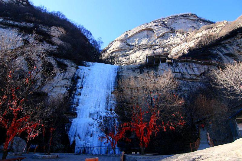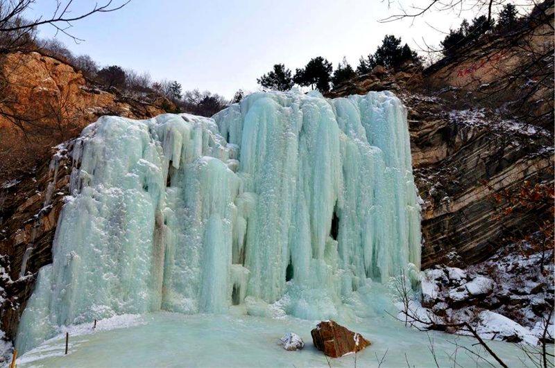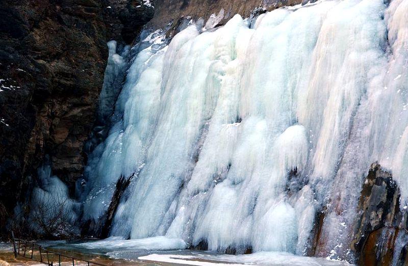 京都第一瀑是京郊流水量最大的瀑布,落差62.5米。冬季,随着气温的逐渐降低,流水结冰后层层叠叠,漫延至石壁四周,形成京都第一冰瀑,远远看去似一条玉雕的巨龙从崖壁上垂头汲取冰潭中的水;近看像天上的银河飘落在石壁之上,令人心动。