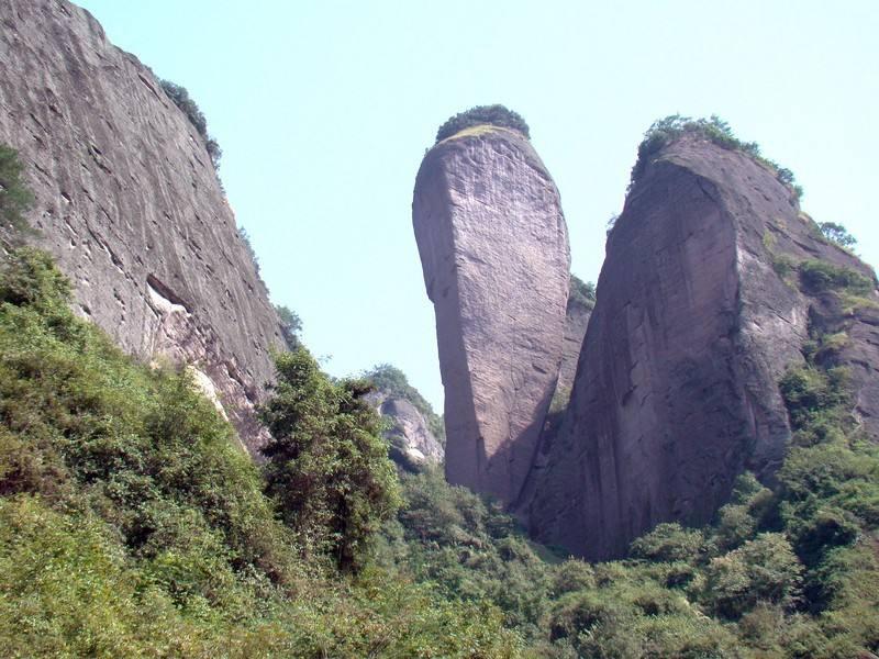 崀山的八角寨最出名,因为从山上看下面的八座小山的峰顶就像八个羊角,所以取名八角寨。我们到了崀山的头一站就是直奔八角寨,八角寨的山高果然名不虚传,我们费了九年二虎之力才登上了山顶,途中,虽然很累,腿脚发麻,但是沿途能欣赏到各种美景,一切的疲倦都化为乌有,山间五颜六色的野花朝着我们绽开了笑脸,招手欢迎远方客人的到来;绿树挺直腰板一动不动地站在山头,凝视着爬山人们的一举一动;小虫,小鱼、小虾在小溪里跳起了欢快的圆舞曲,此情此景,真是美仑美奂!