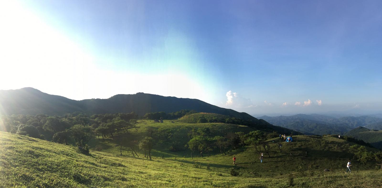 海拔1100米之上的区域便是高山草原,它有个很好听的名字,叫“百鸟堂营地”。由众多小山包组成的草原虽说算不上真正意义上的大草原,但也算意境清新:绿草小山包连绵起伏,一眼望不到边;五彩缤纷的野花点缀在每个角落,处处显露着无限生机。草原上的气温比山下低6摄氏度,如果在山上扎营,可以看到日出、日落的绚丽景观。