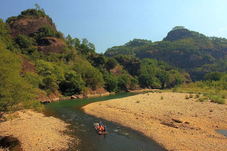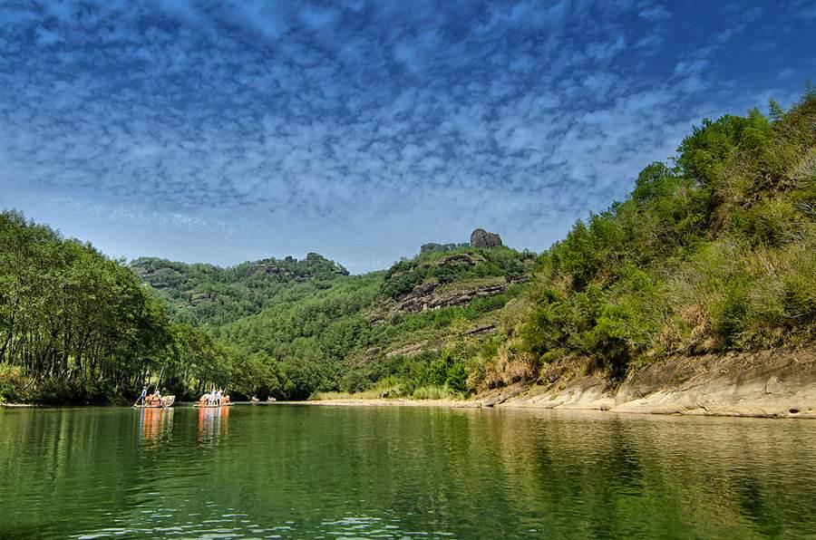 九曲溪是武夷山胜景的灵魂所在,是九曲溪与武夷山山水环抱形成了今日武夷山碧水丹山的美景。武夷山三十六峰,九十九岩,峰岩交错,溪流纵横,九曲溪贯穿其中,蜿蜒十五华里。山挟水转,水绕山行,每一曲都有不同景致的山水画意,“溪流九曲泻云液,山光倒浸清涟漪。