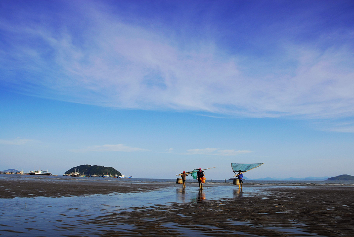 这里以“S”湾和渔船穿梭进出的繁忙景象闻名。海带收获季节,竹杆上挂满晾晒的海带,渔民驾着小船在S形港湾水道上穿梭忙碌,一构成了一幅完美的滩涂风光画。