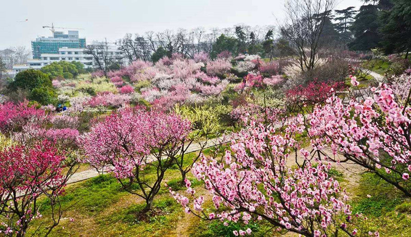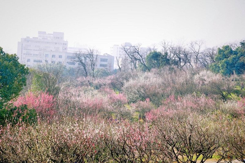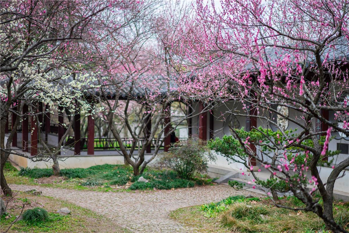 漫山遍野的梅花固然喜人,水边寻梅也是灵动盎然,在玄武湖的梁洲,清澈的湖水环绕着一片梅花林。这里梅花绽放时,粉色、白色、绿色……只有梅花一种,也同样姹紫嫣红。还为赏梅专门设计了梅花岭、梅花廊道、梅花岛、梅花花坛、梅花隔篱等