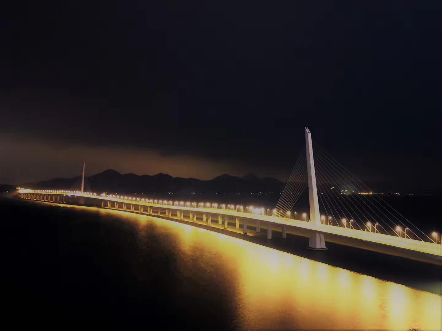 夜晚深圳湾大桥发出美丽的亮光,照亮平静的海面,让人观看后心有宁静的感觉。