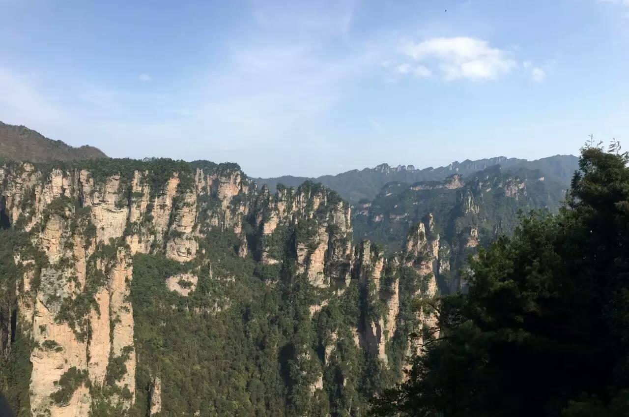 石峰石柱的周围是壁立的悬崖,裸露出红色的岩石。而峰顶平坦之处却生长着一簇簇葱绿的森林。这些长在峰顶的森林,像一个个时髦的“朋克头”,构成一道奇特的风景。
