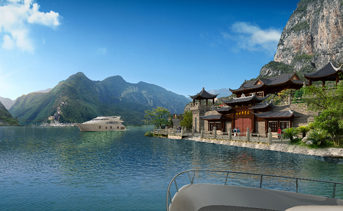 重庆市巫山县大昌古镇地处长江以北,大宁河中游、小三峡风景区。从巫溪县城出发,坐船沿大宁河下行两个多小时,新小三峡旅游的终点,依山傍水、绿荫掩映、青墙黛瓦的地方就是大昌古城。大古镇建在大宁河畔,占地约10公顷,现名为“解放街”的街道呈“T”字形,串通东、西、南3座城门,东西街长350米,南北街长200米。人们形容古城四面可通话,一灯照全城的袖珍古城。镇内建筑属砖木结构,大多为四合井院,青砖黛瓦、雕梁画栋,翘角飞檐、古朴幽雅,具有浓郁的江浙风格。