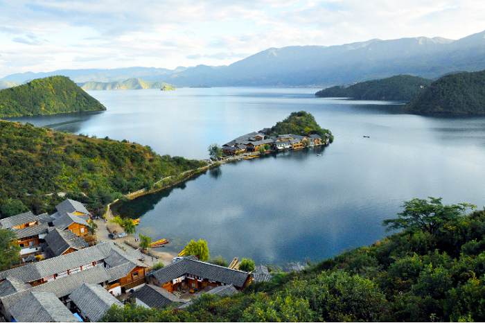 形态各异,湖中各岛婷婷玉立。林木葱郁,翠绿如画,身临其间,水天一色,清澈如镜,藻花点缀其间,缓缓滑行于碧波之上的猪槽船和徐徐飘浮干水天之间的靡梭民歌,使其更增添几分古朴、几分宁静,一个远离嚣市,未被污染的处女湖。丽江泸沽湖置身于此,仿佛置身于天堂。