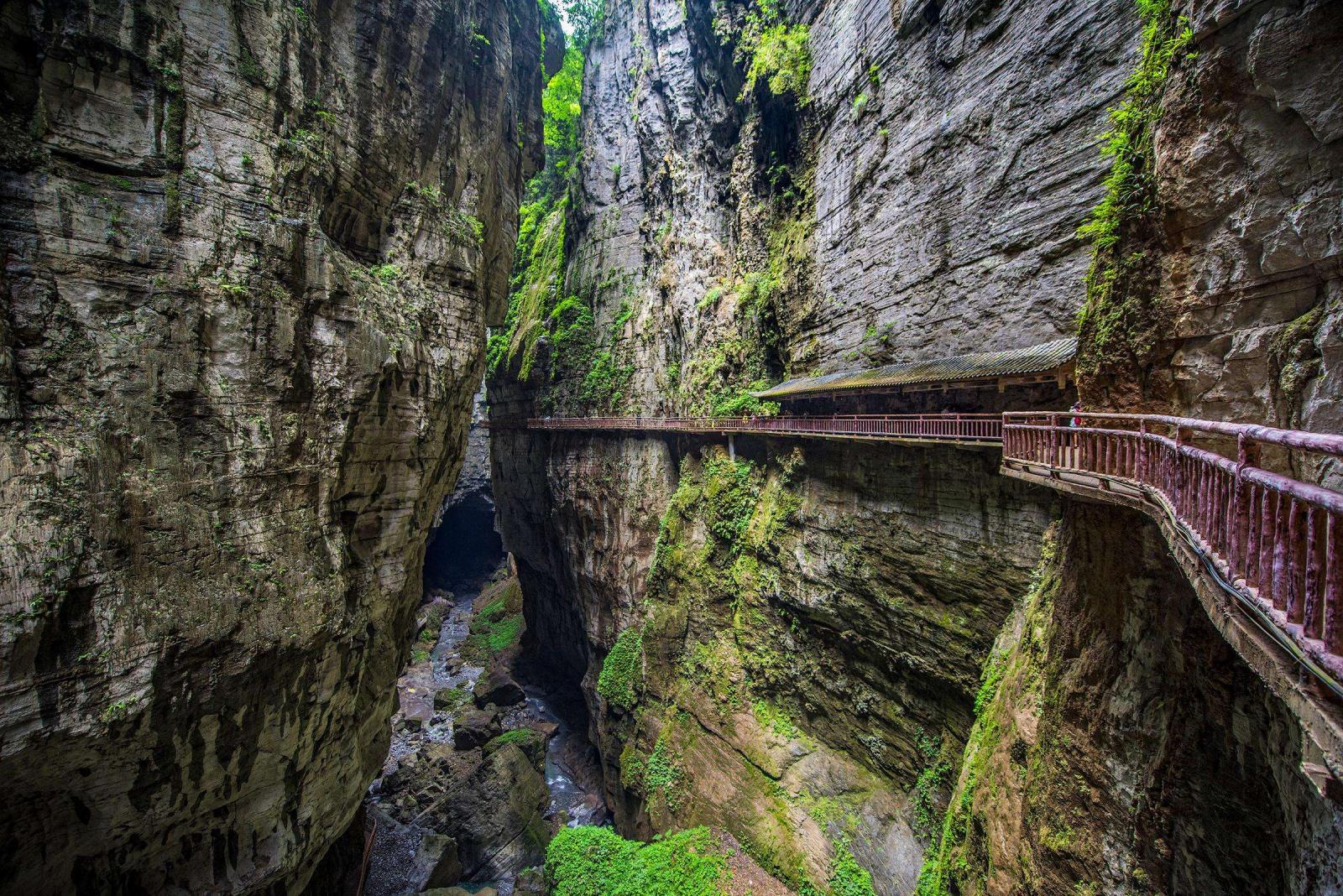 武陵山大裂谷位于重庆市涪陵区城东南约40公里的武陵山乡境内,景区核心区为一条长约10公里的喀斯特地貌原生态裂谷,整个裂谷气势磅礴,两岸层峦叠嶂,瀑布直挂绝岭,谷底奇石叠垒,让人目不暇接,美不胜收。