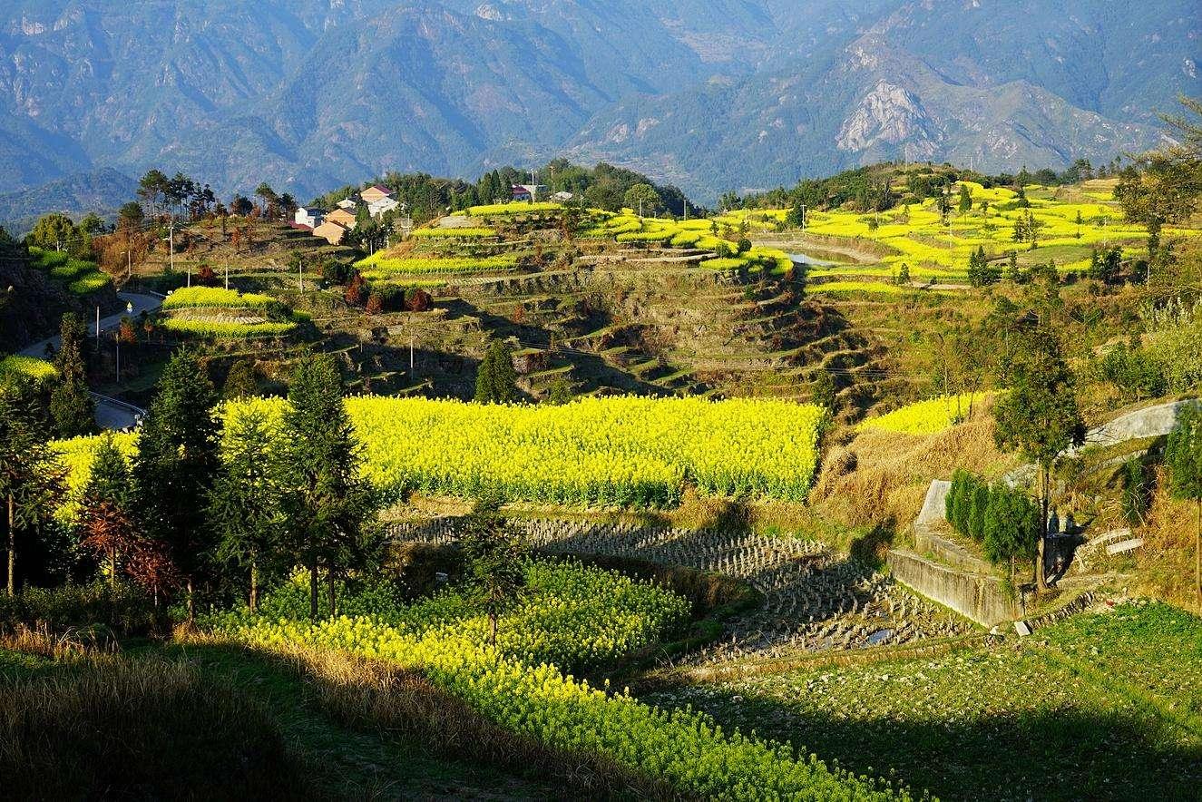 汉阴县漩涡镇的地形呈梯形,兼有河谷、低山和中山。始建于清代道光年间的万亩梯田生态环境优美,梯田密集,形态原始,阡陌纵横,线条流畅,山高水长,梯田中间阡陌人家,在巴山深处若隐若现,充满诗意的田园风光。这里的油菜花属于山地河谷型,有立体感,拍摄照片层次感强。