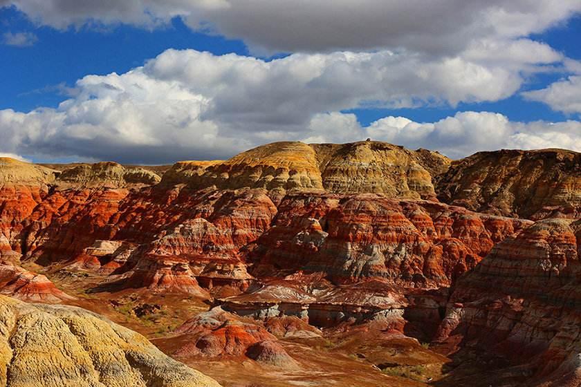五彩城位于新疆古尔班通古特沙漠东部的吉木萨尔境内,典型的雅丹地貌。早在侏罗纪时代,这里沉积着很厚的煤层,历经风蚀雨剥,煤层表面的沙石被冲蚀殆尽,又经曝晒或雷击起火,煤层燃尽后,烧结岩堆积,加之各地质时期矿物质含量不同,这一带连绵的山丘便呈现赭红为主夹杂着黄白黑绿等多种色彩,再经风吹日晒雨剥,又呈“雅丹地貌“,远望近观,状如城廓,五彩城由此得名。