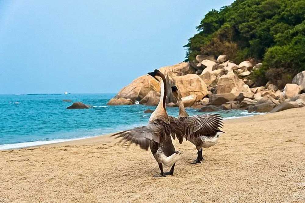 在沙滩上,你会偶遇上不少小有名气的“网红鹅”,它们的神态相当可爱。