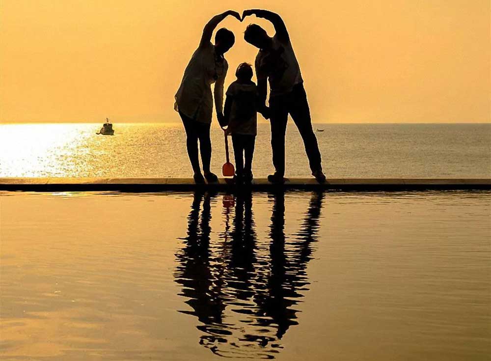 不一会儿霞光满天,海面一片落日余晖。有的人静静在断桥边垂钓,有的人走在海里亲密戏水,还有欢乐的一家三口,看到这幅温馨画面,突然有种莫名的感动。