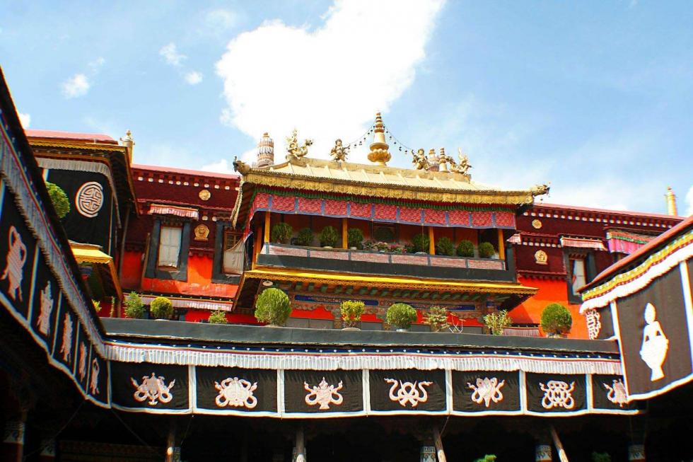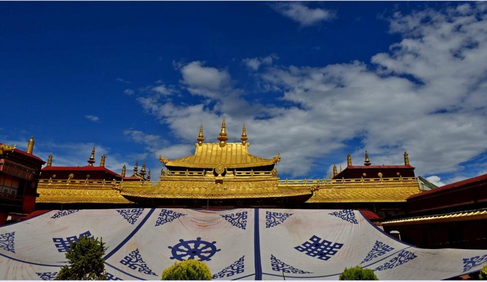 简介:大昭寺位于拉萨市中心,是西藏现存最辉煌的吐蕃时期的建筑。主殿三层,殿顶覆盖着西藏独具一格的金顶,阳光下浮光耀金。 寺内有长近千米的藏式壁画《文成公主进藏图》和《大昭寺修建图》,还有两幅明代刺绣的护法神唐卡,这是藏传佛教格鲁派供奉的密宗之佛中的两尊,为难得的艺术珍品。寺内主供的释迦牟尼像是文成公主入蕃带进的,拉萨之所以有“圣地”之誉,与这座佛像有关。寺庙最初称“惹萨”,后来惹萨又成为这座城市的名称,并演化成今天的“拉萨”。 从大昭寺金顶俯瞰大昭寺广场,右边远处山上是布达拉宫,近处的柳树是“公主柳”,相传是文成公主所栽。大昭寺的布局方位与汉地佛教的寺院不同,其主殿是坐东面西的。主殿高四层,两侧列有配殿,布局结构上再现了佛教中曼陀罗坛城的宇宙理想模式。寺院内的佛殿主要有释迦牟尼殿、宗喀巴大师殿、松赞干布殿等等。寺内各种木雕、壁画精美绝伦,空气中弥漫着酥油香气,藏民们神情虔诚地参拜转经。大昭寺殿高4层,整个建筑金顶、斗拱为典型的汉族风格。碉楼、雕梁则是西藏样式,主殿二、三层檐下排列成行的103个木雕伏兽和人面狮身,又呈现尼泊尔和印度的风格特点。