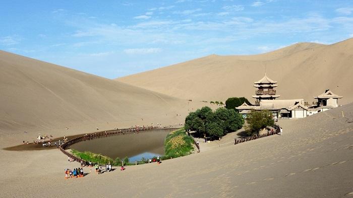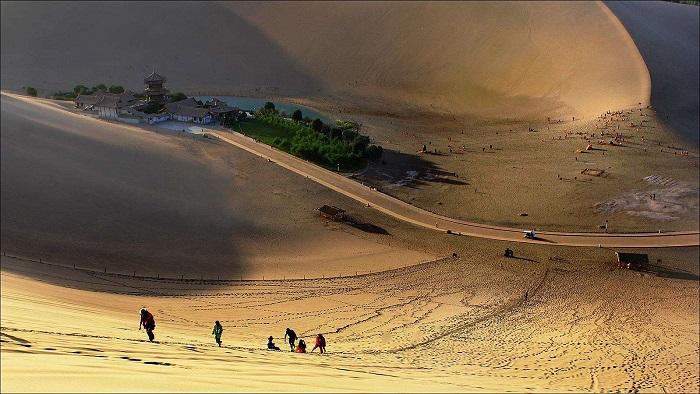 古往今来以“山泉共处,沙水共生”的奇妙景观著称于世,被誉为“塞外风光之一绝”。1994年被定为国家重点风景名胜区,鸣沙山有流沙积聚而成,沙体遇到摩擦震动,便会殷殷发声,轻若丝竹,重如雷鸣,故名“鸣沙山”,月牙泉位于鸣沙山北麓,因外形酷似一弯新月,故名“月牙泉”。千百年来不被流沙淹没,不因干旱而枯竭。