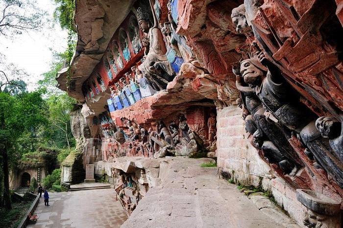 大足石刻,是重庆市大足区(原大足县)境内以佛教题材为主的摩岩石刻的石窟总称,包括宝顶山、北山、南山、石门山、石篆山等处,在这里可欣赏到代表中国唐、宋时期的石刻造像艺术。这里因地处山区,交通不便,避免了战争和人为的破坏。