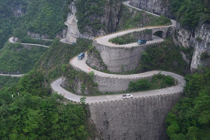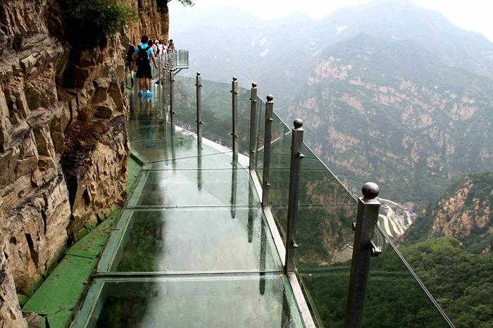 世界上最大的玻璃观景平台。“玻璃栈道”设在396米深的山谷边缘,崖壁外悬空32.8米,面积415平米,比号称世界“第八大奇景”的美国科罗拉多大峡谷廊桥还长11米,面积大了一倍多。观景台距崖底400多米,置身台上,玻璃剔透,下视无碍,似无所依,令人举步惊心。