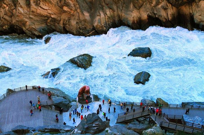 摇摇欲坠的天梯,中国最深的峡谷之一。虎跳峡共18处险滩,江面最窄处仅30余米,江水被玉龙、哈巴两大雪山所挟峙,海拔高差3900多米,峡谷之深,位居世界前列。虎跳峡不仅深,而且窄,许多地方,双峰欲合,如门半开;身入谷中,看天一条缝,看江一条龙;头顶绝壁,脚临激流,令人心惊胆战。