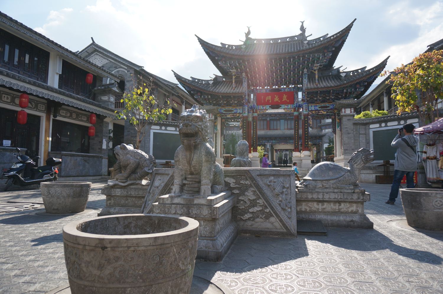 大理古城东临碧波荡漾的洱海,西倚常年青翠的苍山,形成了“一水绕苍山,苍山抱古城”的城市格局。街巷间一些老宅,也仍可寻昔日风貌,庭院里花木扶疏,鸟鸣声声,户外溪渠流水淙淙,“三家一眼井,一户几盆花”的景象依然。古城内东西走向的护国路,被称为“洋人街”。这里一家接一家的中西餐馆、咖啡馆、茶馆及工艺品商店,招牌、广告多用洋文书写,吸着金发碧眼的“老外”,在这里流连踯躅,寻找东方古韵,渐成一道别致的风景。