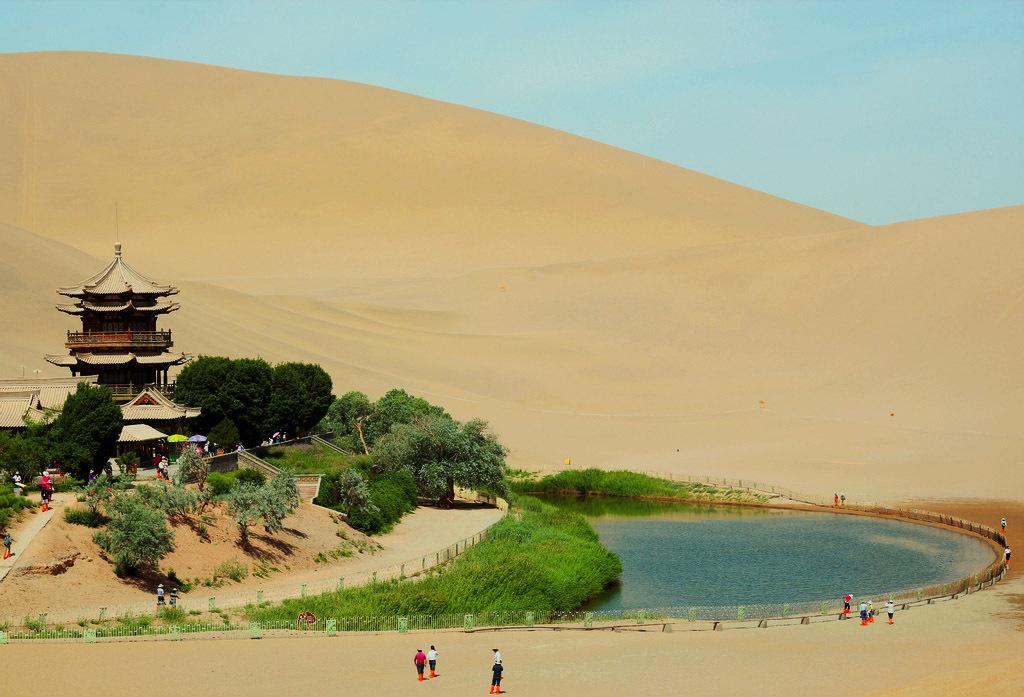 月牙泉南北长近100米,东西宽约25米,泉水东深西浅,最深处约5米,弯曲如新月,因而得名,有“沙漠第一泉”之称,自汉朝起即为“敦煌八景”之一,1994年列入国家级风景名胜区。