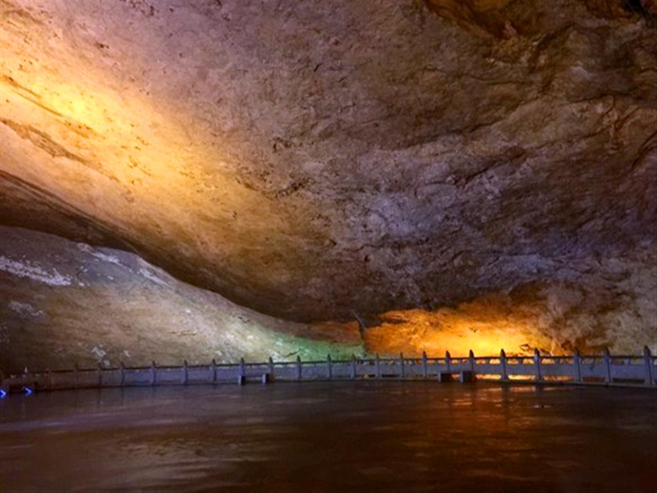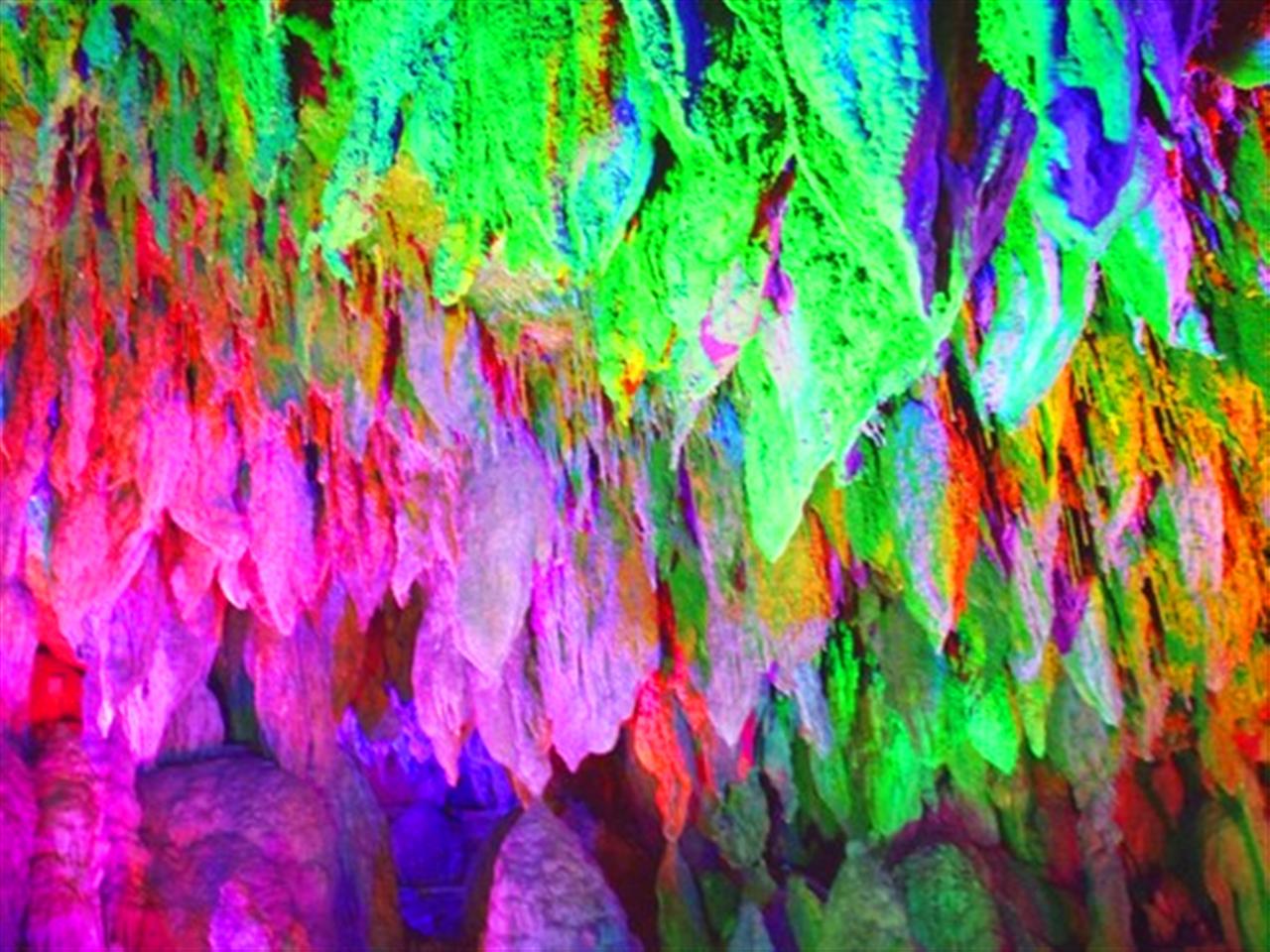 蝙蝠洞的很多钟乳石显得不那么圆滑,更尖锐短小,而且给人一种弱不禁风的错觉,似乎那些弯曲的角度都是被地下的风吹动所致,而这里用上了密集的彩灯照射,红绿蓝交错后就像立体电影的母本,竟看得人眼花缭乱,有种看红绿三D图地既视感。