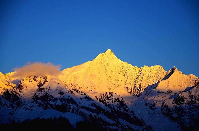 梅里雪山,又称“雪山太子”,位于云南迪庆藏族自治州德钦县,金沙江、澜沧江、怒江在那里汇流。它延绵起伏的海拔超过6000米的十三峰雄奇壮美。其中主峰卡格博(又称卡瓦格博)被誉为“世界最美之山”,海拔6740,被誉为“雪山之神”。在淳朴的藏区人民心中,梅里雪山是一座圣山,他们相信每一座高山都有一位山神统领一方,而卡格博则统领着整个自然界。