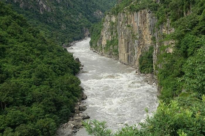 奔腾的怒江,仿佛是一条被激怒了的金色大蟒,自北向南奔腾而来。汹涌澎湃的江水,冲击着石崖,震撼着山谷,发出巨大的轰鸣声……像怒江这样狂暴、险恶的河流,只有到此旅行,亲自耳闻目睹,才能体会到怒江这个名字真是取得太妙了-这是一条真正的愤怒之河啊!