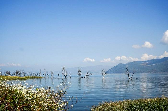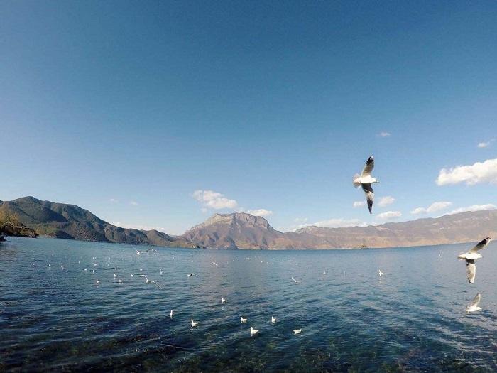 泸沽湖畔四季鲜花常开,宛若一座天然花园。云淡风轻,落花流水,在寂静中聆听风的歌声。湛蓝的湖水被群山围绕,透明的湖面就像一块画板,绘出天空的澄澈,白云的多姿,远山的绵延,写意般的唯美。