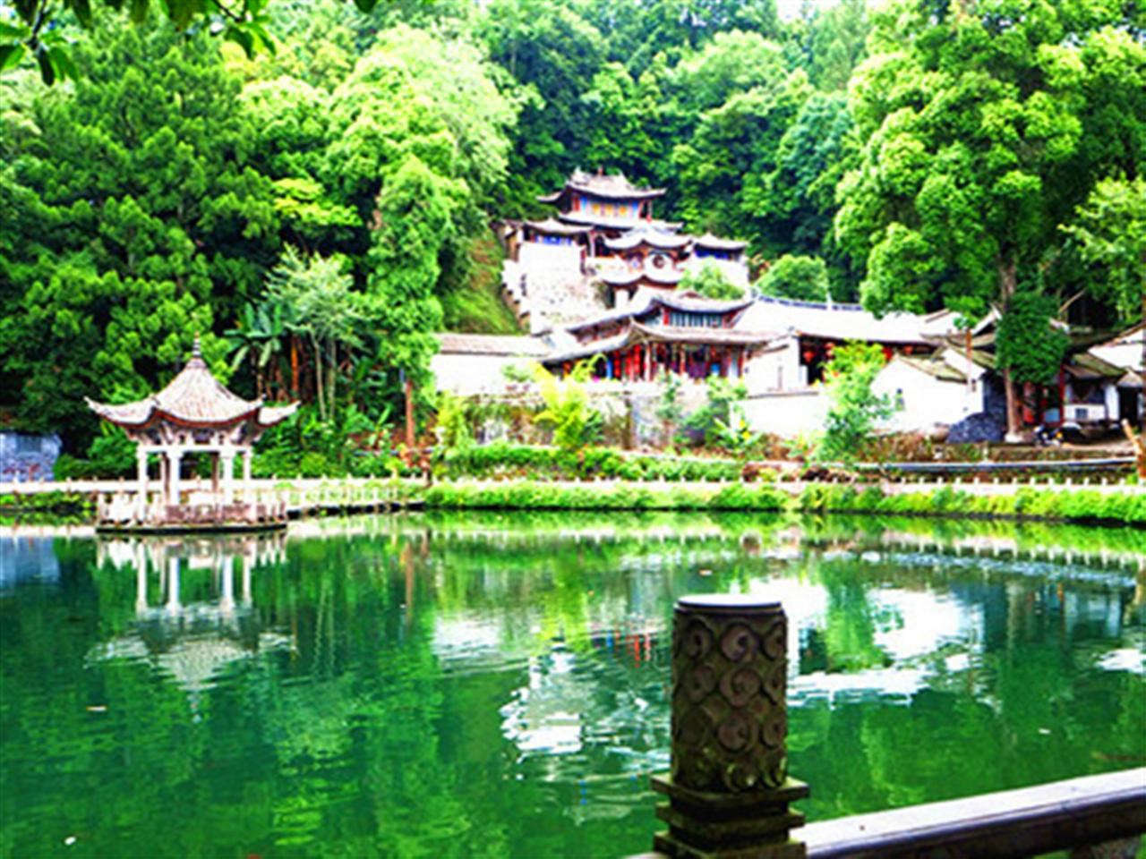 竹影摇曳,树影婆娑,倒影在湖水中,一片碧绿。一条窄窄的石桥通向湖心亭,把整座水面装饰的有模有样。龙湖的一侧是一块不大的广场,广场上的一棵大树遮天蔽日,对面,是一对高大的水车,吱吱呀呀的转动着。临湖就是建于明代崇祯年间的元龙阁,那是一座儒、释、道三教合一的道观,整座道观临山而建,上到最高处,龙湖的一泓碧水就在脚下。