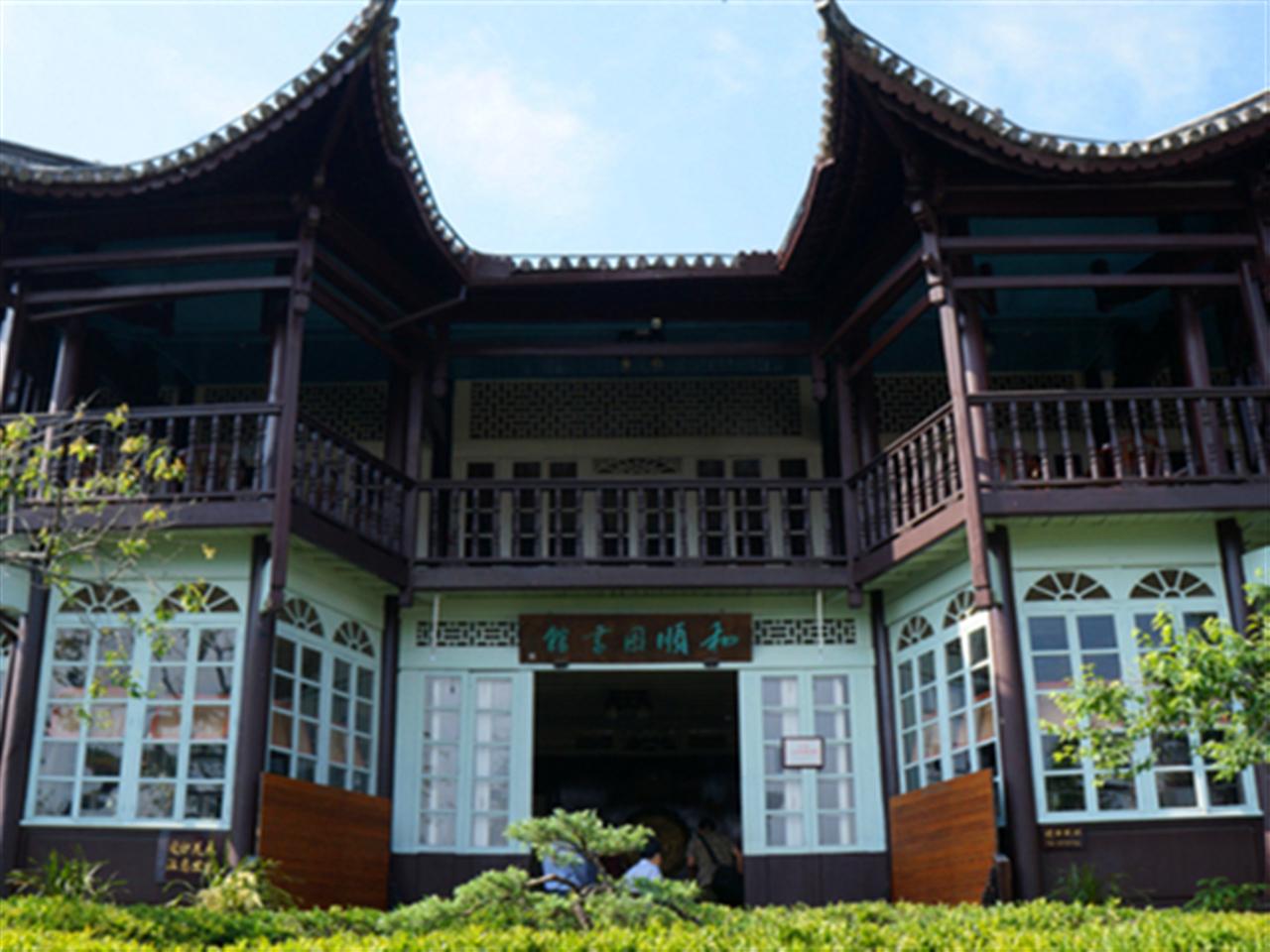 和顺图书馆位于村子正中双虹桥畔,建于民国13年(公元1924年),馆舍为中国传统的楼房建筑。它背靠依山建房的密集村落,门迎宽阔富饶的和顺坝子,两条小溪从门前穿过,图书馆右侧是益群中学。图书馆的第一道大门居高临下,气宇轩昂,上悬黑底金字大匾:和顺图书馆,为乡人张励所书。沿阶而上为二门,系仿苏州原东吴大学门面建造的三孔西式铁门,空灵秀美。上有和顺图书馆(胡适)、文化之津(李石曾)等匾额题词。进入天井,则为小花园,正中修剪整齐的黄香木树围成一圈,绿树红花,春意盎然。过花园即是图书馆主楼。这是一座两层上下各五格的中式建筑,第二、四格伸出成六角亭。屋架轩敞,柱少梁多,上下均为玻璃窗,室内显得宽敞明亮,四壁着色素雅大方。