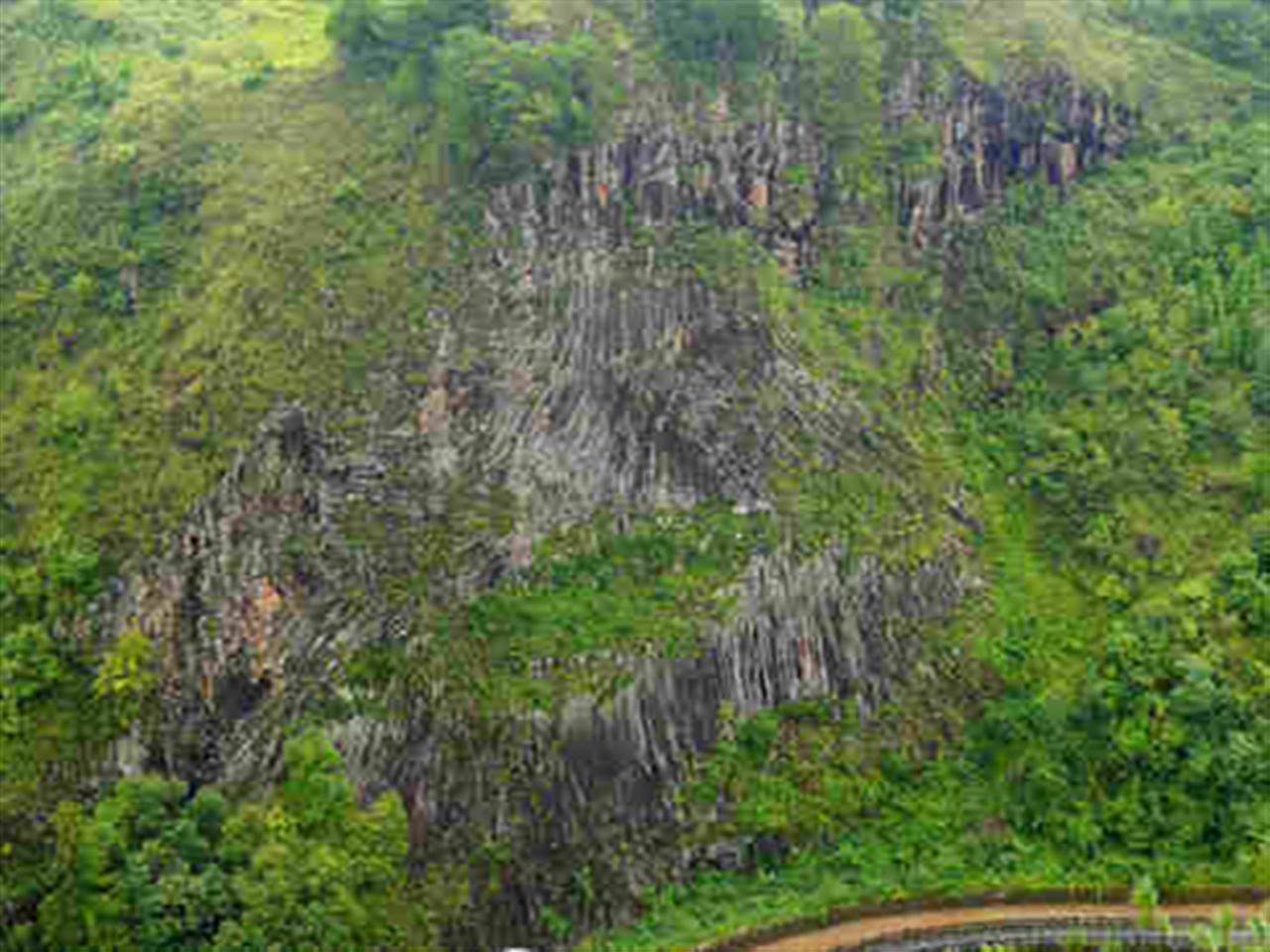 在云南省腾冲县的龙川江畔,矗立着一大片火山爆发时喷出的未露于地表的岩浆冷凝后形成的柱状结晶,地质学上称为“柱状节理”,当地人则形象地叫它“ 神柱”。 “神柱”是我国迄今为止发现的一片规模最大、保存最完整、年代最短的柱状节理。火山岩浆喷发时的温度为1200℃,当岩浆冷却至800-900℃时岩浆结晶形成柱状节理。由于岩浆含有六方柱体的斜长石、橄榄石、角闪石、辉石等矿物质,所以冷却后形成六方柱体,称之为:柱状节理。