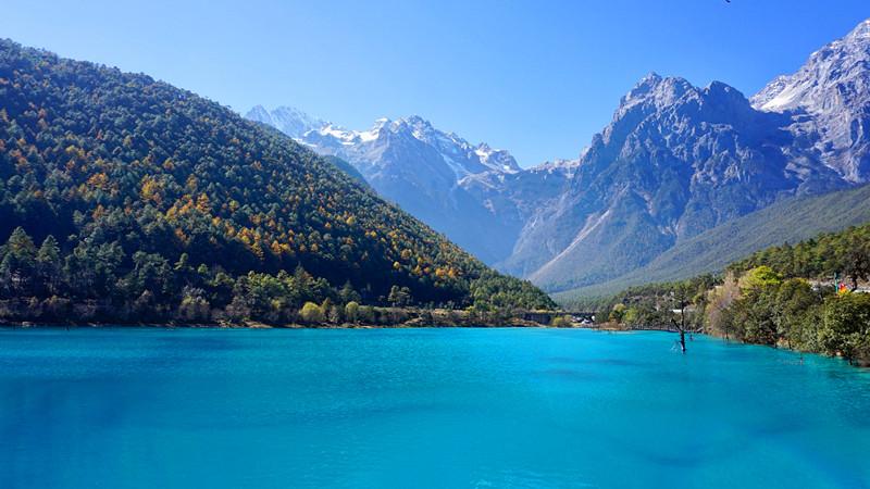 丽江蓝月谷,在晴天时,水的颜色是蓝色的,而且山谷呈月牙形,远看就象一轮蓝色的月亮镶嵌在玉龙雪山脚下,所以名叫蓝月谷。而白水河这个名字是因为湖底的泥巴是白色的,下雨时水会变成白色,所以又叫白水河。玉龙雪山冰雪融化成河水从雪山东麓的一条山谷而过,因月亮在蓝天的映衬下倒影在蓝色的湖水中,又因英国作家瞻姆斯希尔顿笔下的《消失的地平线》中的蓝月亮山谷近似于此。故名“蓝月谷”。