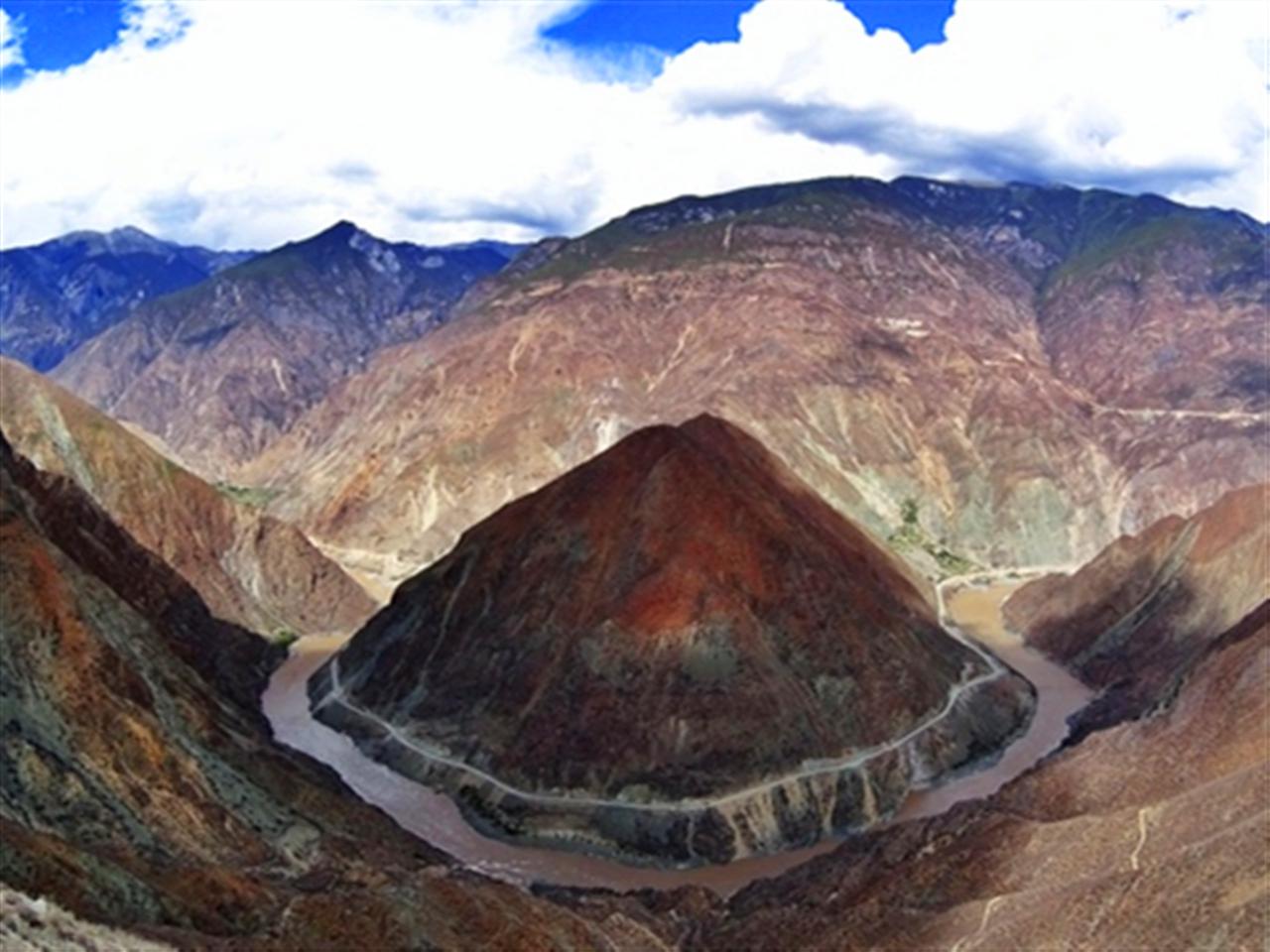 金沙江大拐弯也叫做月亮湾,由北向南纵贯全境的定曲河,在先后接纳了玛伊河和硕曲河之后,携三江之水投入了金沙江的怀抱,在江水汇合处,形成“三壁夹两江”的奇景。穿山越谷而来的金沙江,在即将冲出这川滇要塞之时,似乎想先舒缓一下长途奔波的疲劳,于是放慢脚步,围绕着金字塔般的日锥凤潇洒地画上了一个“U”字形的大拐弯。金沙江大拐弯是国内四十大景观之一,从山顶俯瞰全景,使人在心旷神怡,荡气回肠之际,不能不惊叹自然造化的神奇!