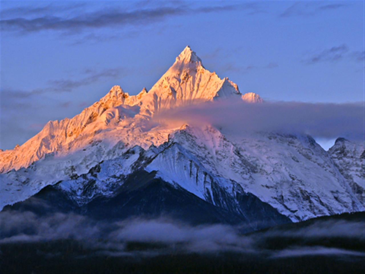 当地人叫神女峰,海拔6054米,是梅里雪山十三峰之一。她亭亭玉立、气质若兰,传说是卡瓦格博山神的妃子。 缅茨姆峰从不同的侧面看,形状也不相同。从东面观之,峰顶极似一尖削的金字塔;从东南面观之,则像一端坐的贵妇人,峰顶俊秀,气态高贵。缅茨姆峰的皑皑雪峰之下是成片成片的高山杜鹃灌丛,开花之时铺地似锦,更使雪峰分外妖娆。