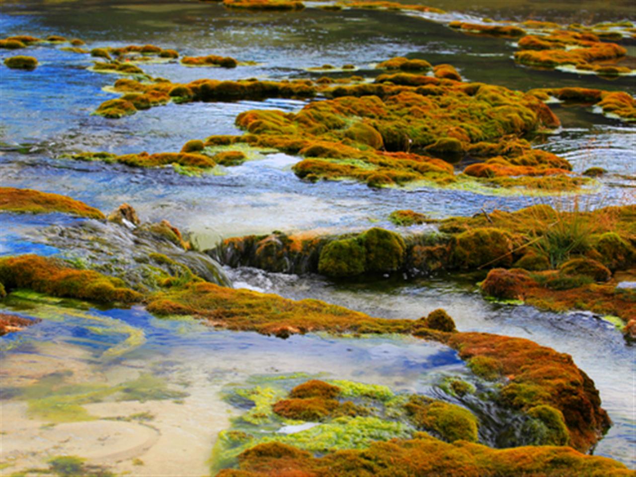泉华滩是一种并不多见的喀斯特地形,也许去过黄龙的蜂蜂会觉得眼前的钙化池似曾相识,但泉华滩更显神秘美丽。她藏匿于一个三面环山的凹谷之中,从另一个山头倾斜下来大片的白色钙化土,延伸到谷底后便变化出四层五彩的钙化池,宛如仙境。泉华滩长达900多米,宽100余米,共有8个泉华阶地。而位于最下方的“迎宾池”是8个钙化池中颜色最大也是颜色最绚丽的;有个外形酷似人的手掌的便名为“巴掌池”。在这里,所要做的就是静视她的美,用镜头定格这瞬间。
