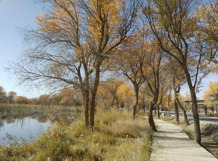 金湖杨,国家5A级景区,国家森林公园,坐落在泽普县西南40公里处的亚斯墩林场境内的戈壁深处,镶嵌在叶尔羌河冲击扇上缘,四面环水,景色宜人。堪称塔里木盆地西南边缘不可多得的一处旅游圣地。