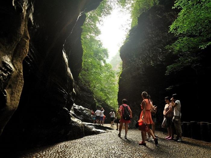 百里峡由三条峡谷组成,全长105华里.峡谷分布形如鹿角,最外边一条被称作 “蝎子沟”:在百里峡景区入口处有一“仙官引路”景点将游人引进蝎子沟,此沟长达25华里,因沟中遍生蝎子草而得名。蝎子沟内有“龙潭映月”、“摩耳崖”等壮景,令人叹为观止。