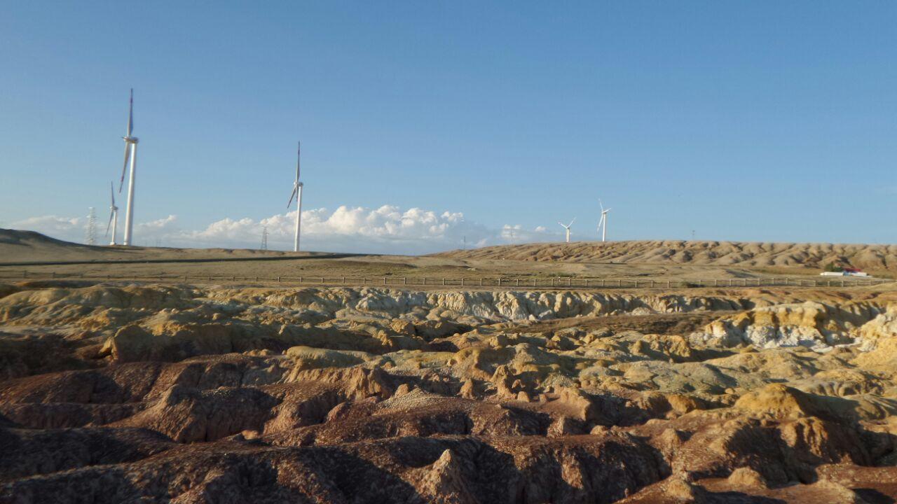 这是一种没有杂色的世界,我们身后的天空湛蓝如水,而面对的天空,却是一种让我们从没有见过的下午时的五彩滩诧异的世界:金色的天与远处的戈壁浑为一体,五彩湾以流畅的动感,颤抖着如同一片没有距离的水晶,起伏着变幻着,时近时远,如同一泻千里的古铜汁液滚滚扑来,又荡荡而过,让人在充满着色泽的变化中感受着痛快淋漓、理解着过瘾的概念。