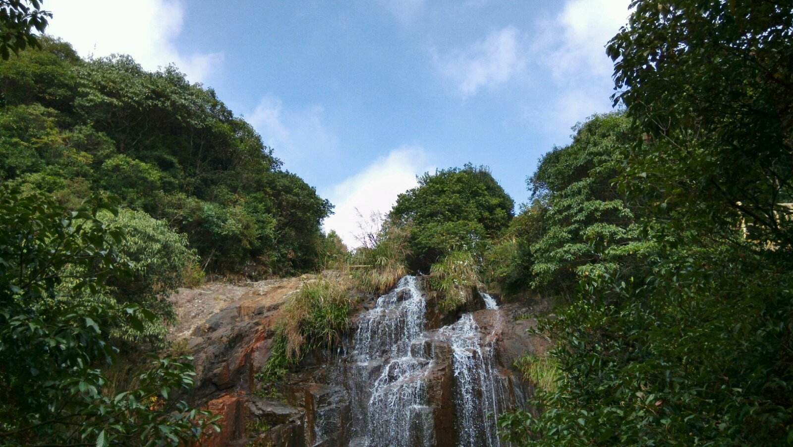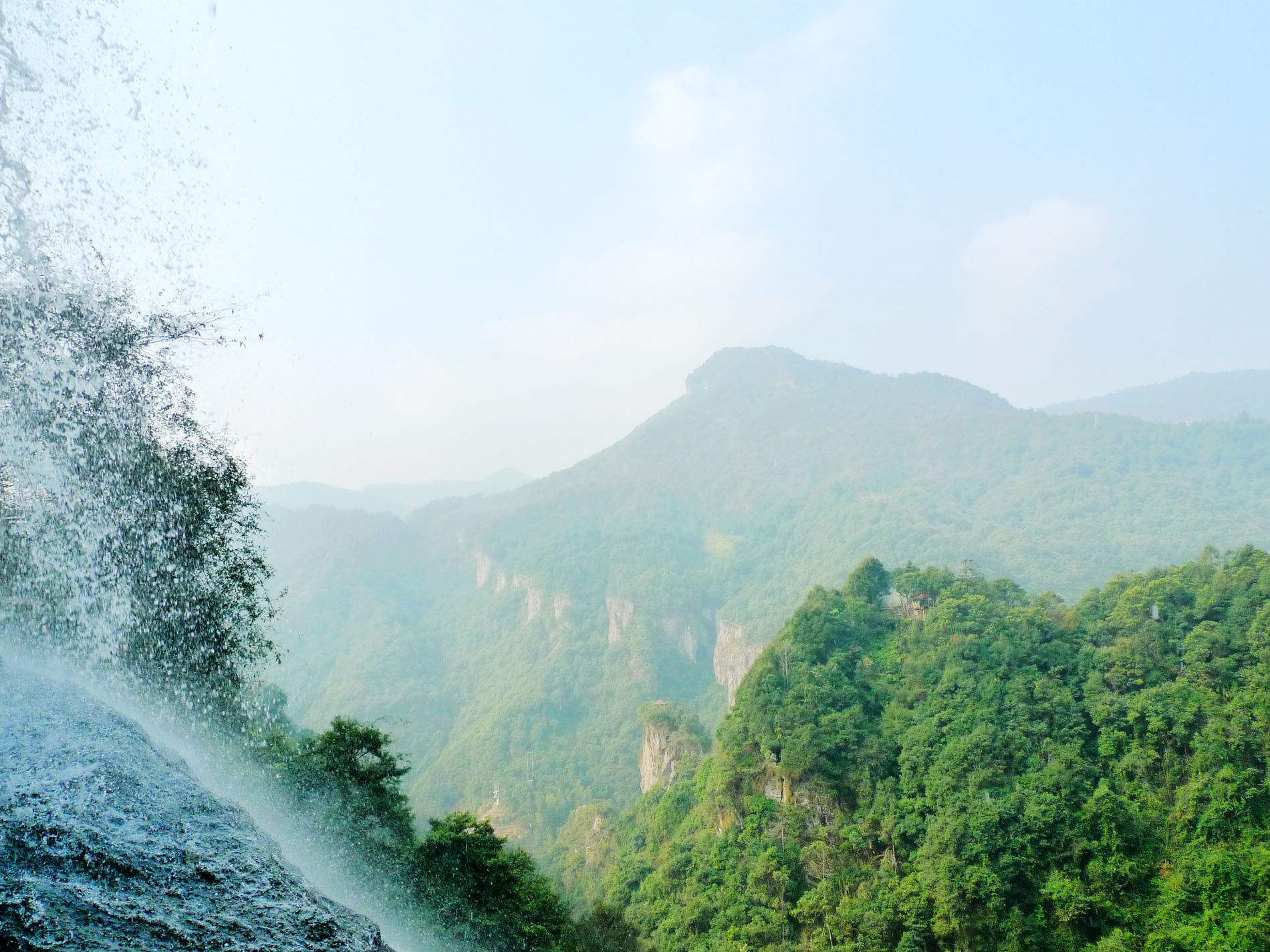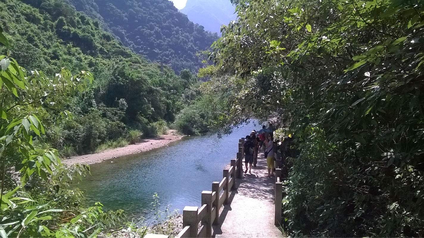 林木秀美视野开阔。缺点是水流量偏小,水质不够清纯,切莫直接饮用。天梯瀑布落差 300米, 数重瀑布叠沓而下,其一竟达百米。瀑底仰望,石壁森然环峙,如处井底。两壁半天悬起一线八十 米长铁锁桥,轻巧单薄。