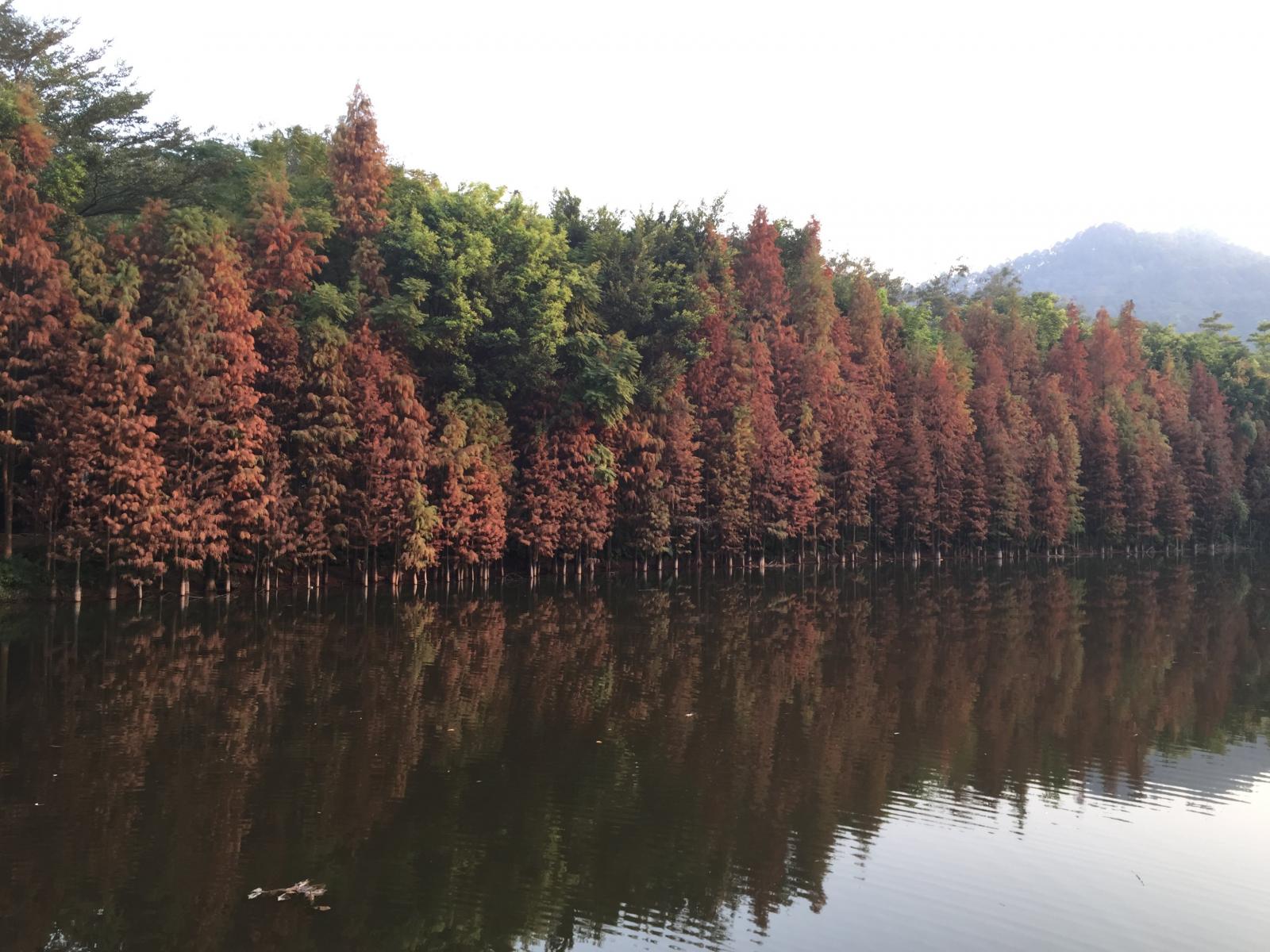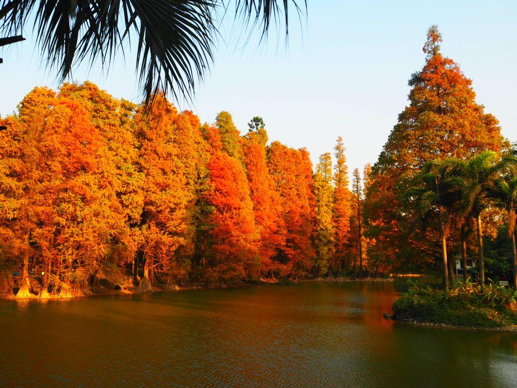在每年11月份至次年1月,树身全面飘红的落羽杉林成片倒映在一弯溪水中,是一年中最美的时光,也是我们赏秋的好去处。而华南植物园的落羽杉林在上世纪还曾以“龙洞琪林”被入列“羊城八景”之一,成为华南植物园最具代表性景点之一。