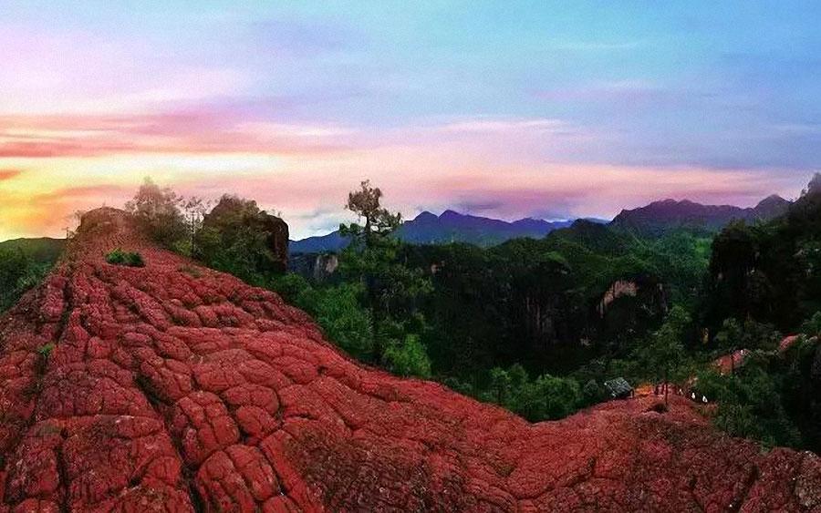 黎明境内还有我国面积最大、海拔最高的一片神奇丹霞地貌区。一大块裸露并风化成片片巨鳞状的山岩,好像一只巨大的乌龟在爬行,龟身上成千上万的巨鳞状山岩又好像一只只小龟,千龟山因此而得名。