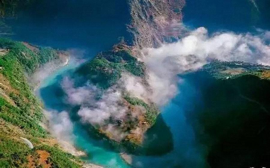 三江并流是指金沙江、澜沧江、怒江三条大河流入滇西北横断山脉纵谷地区,并行奔流400公里的罕见的景象。并流中最好看的要数金沙江大拐弯,它围绕着金字塔般的日锥峰潇洒地画了一个“Ω”字形的大拐弯,成就了一处奇观