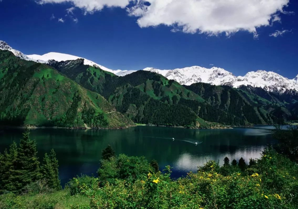 古称“瑶池”,是天山博格达峰北侧的一个半月形湖泊。湖水晶莹如玉,倒映着博格达峰,四周群山环抱,山上布满了挺拔、苍翠的云杉、塔松,漫山遍岭,风景犹如仙境。