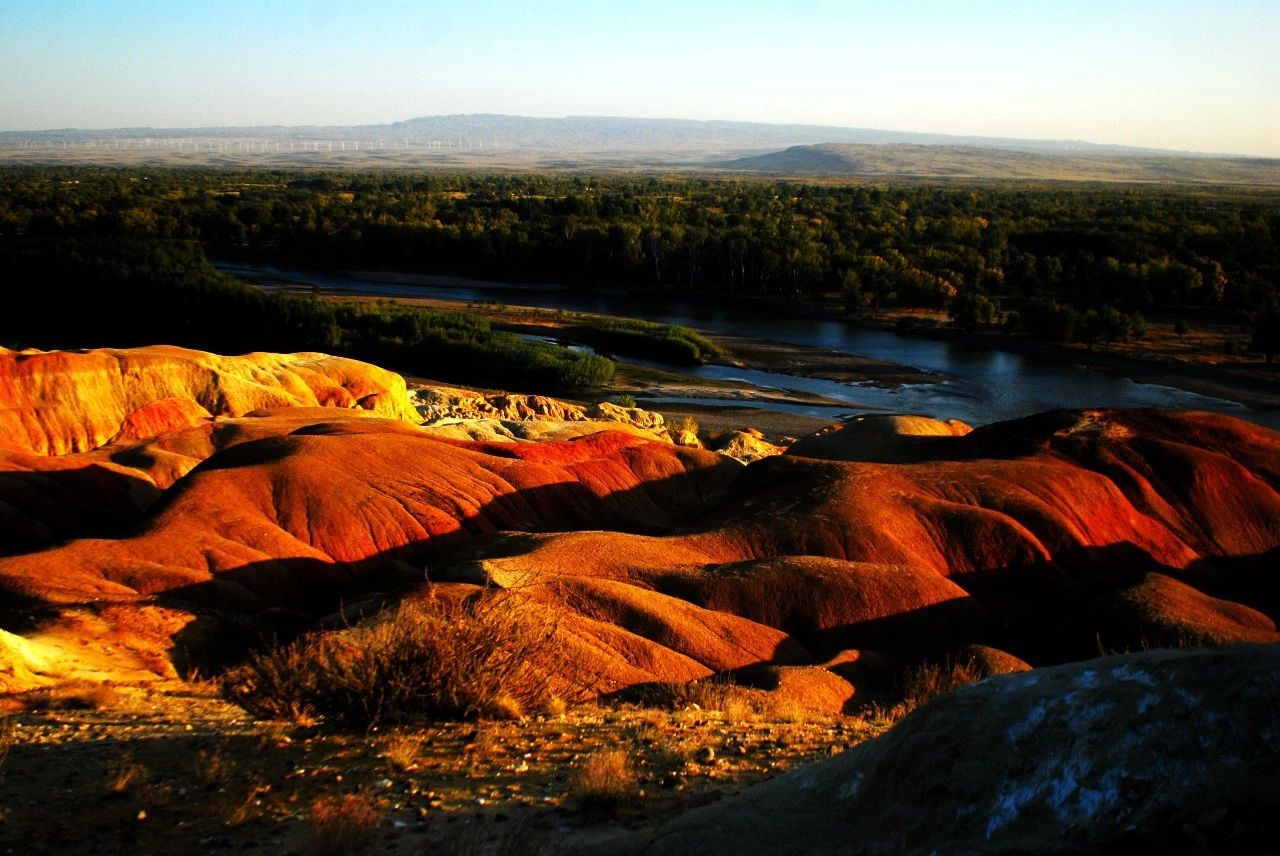 位于新疆布尔津县城西北24公里处的额尔齐斯河北岸,是一个以雅丹地貌著称的河滩。地下侏罗纪时代的煤层,经过千万年风蚀雨剥以及河水的冲刷,在几乎寸草不生的河滩上出现了红、绿、紫、黄、棕等鲜艳的色彩。